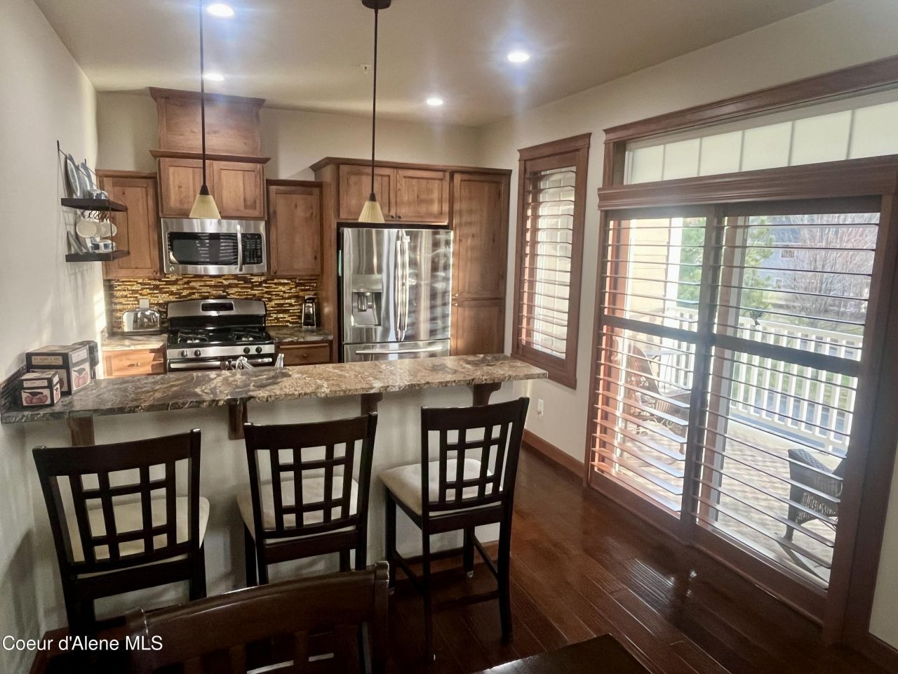Mill River Luxury Condo! Spacious 1,442 SF with a master bedroom on both levels, built-in desk, additional 1/2 bath, and 2-car attached garage. Meticulously kept hardwood floors, brand-new carpet, leathered granite kitchen countertops, wood plantation shutters on all the windows, and quality finishing touches throughout. Enjoy both a covered patio and a covered balcony, plus low-maintenance living with a private fitness center, gated beach access, pavilion, and private beach on the Spokane River.